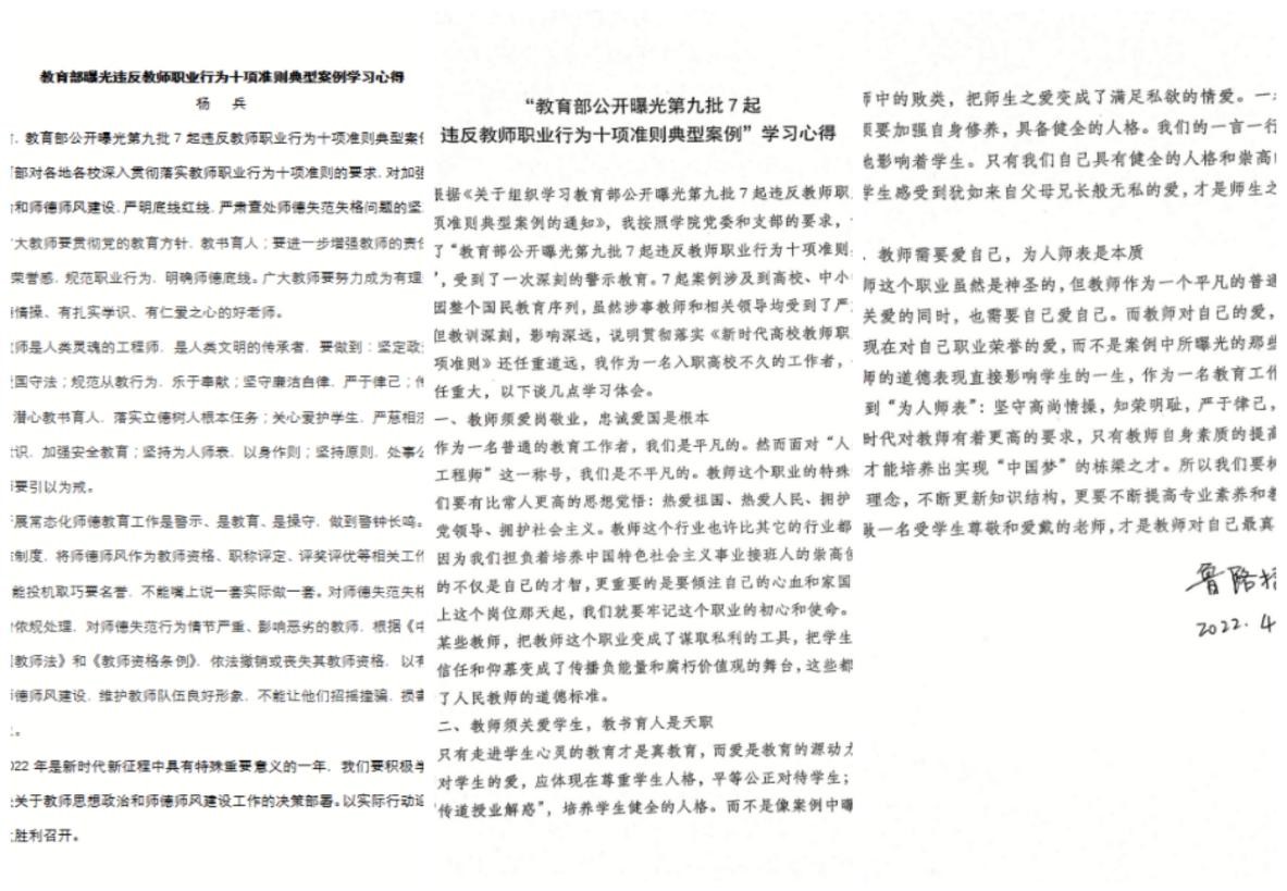 在学院组织的集体学习、探讨的同时,学院教职工对案例材料积极展开自主学习,并对案例背后反映的师德师风问题进行了深刻反思与总结。