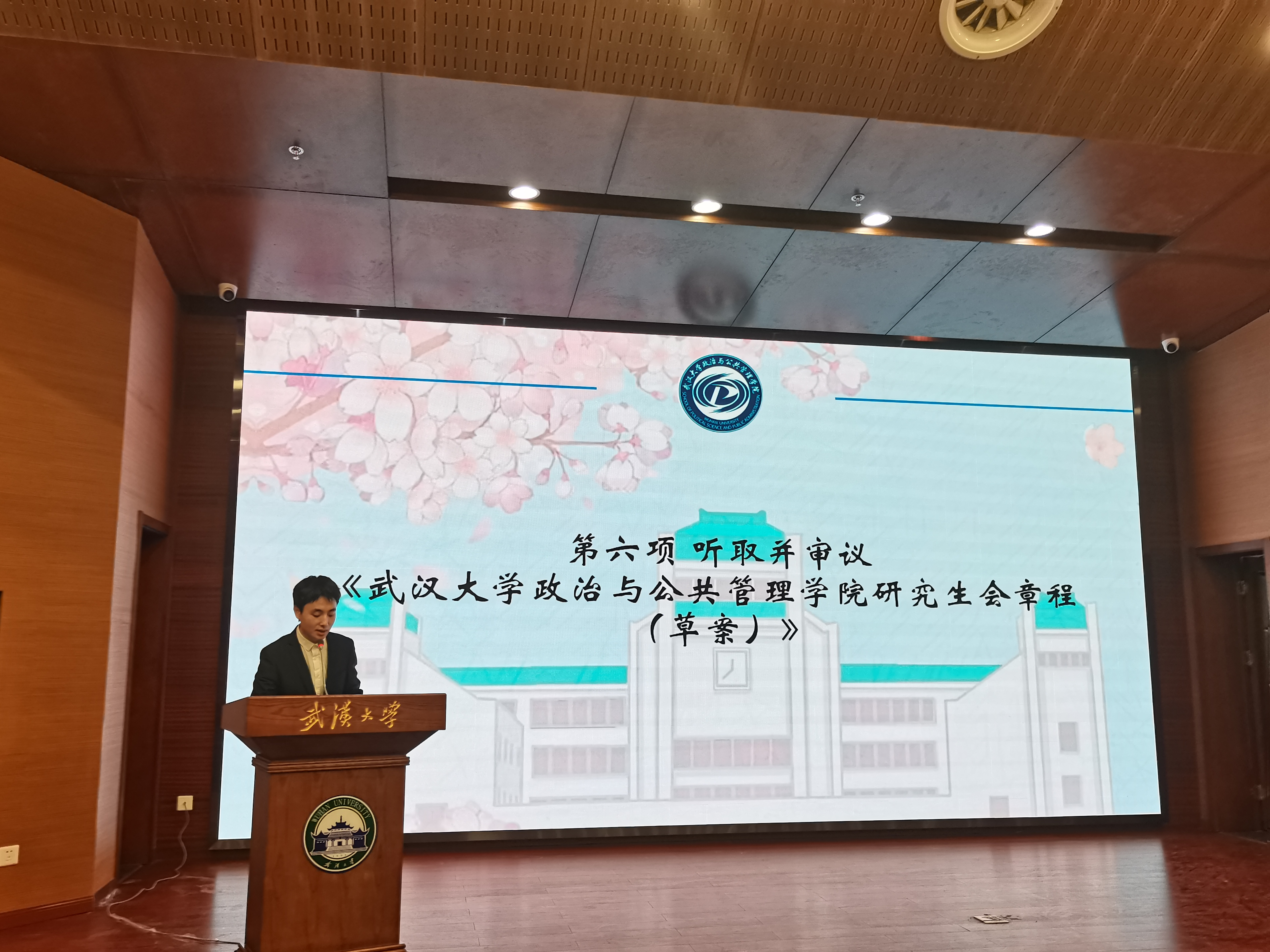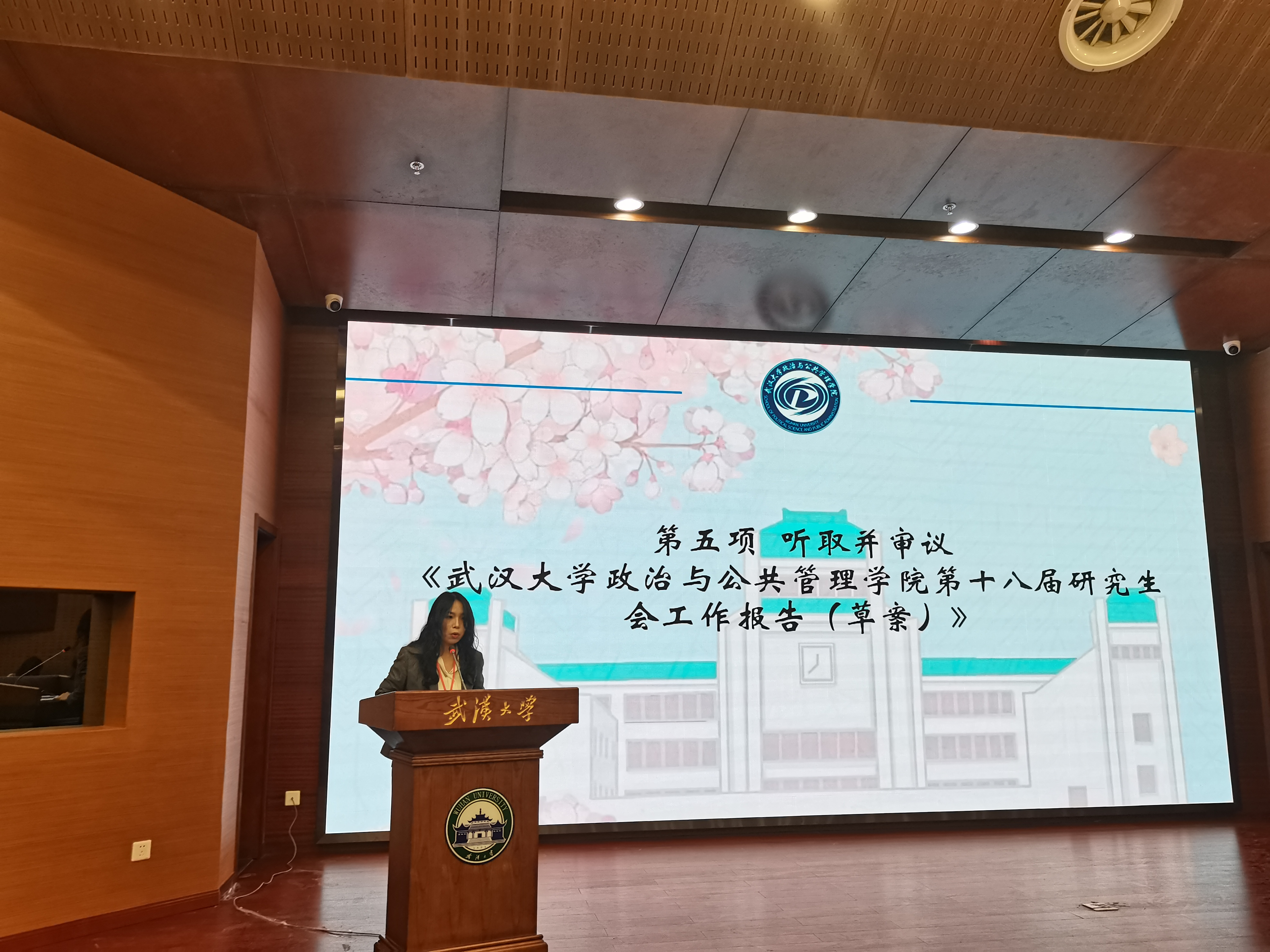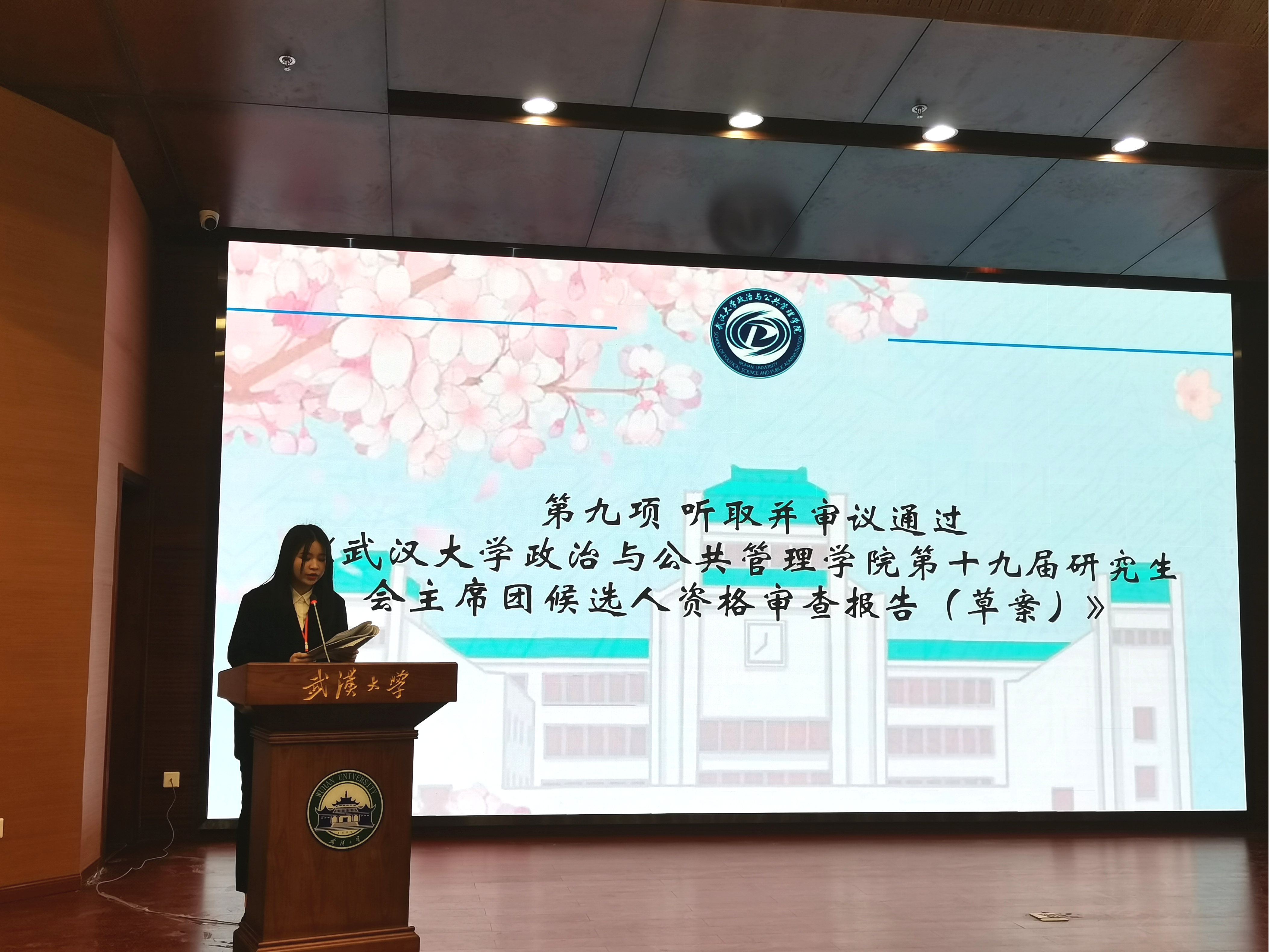 随后,政管院研究生会执行主席徐书凝代表政管院第十八届研究生会,以《戮力同心,弘扬青春政能量;奋楫笃行,谱写研途新篇章》为题作工作报告。徐书凝同学首先带领大家回顾了公司研会一年来在政治引领、组织建设、学术创新、舆论宣传、生活权益、就业指导等方面所做的具体工作及实际成效;接着,报告针对在新的历史机遇下如何应对更大挑战和更高要求做出了三点建议。最后,徐书凝同学代表第十八届研究生会对新一届主席团候选人表达最衷心的期望,勉励大家立足新起点,展望新高度,开创新局面。