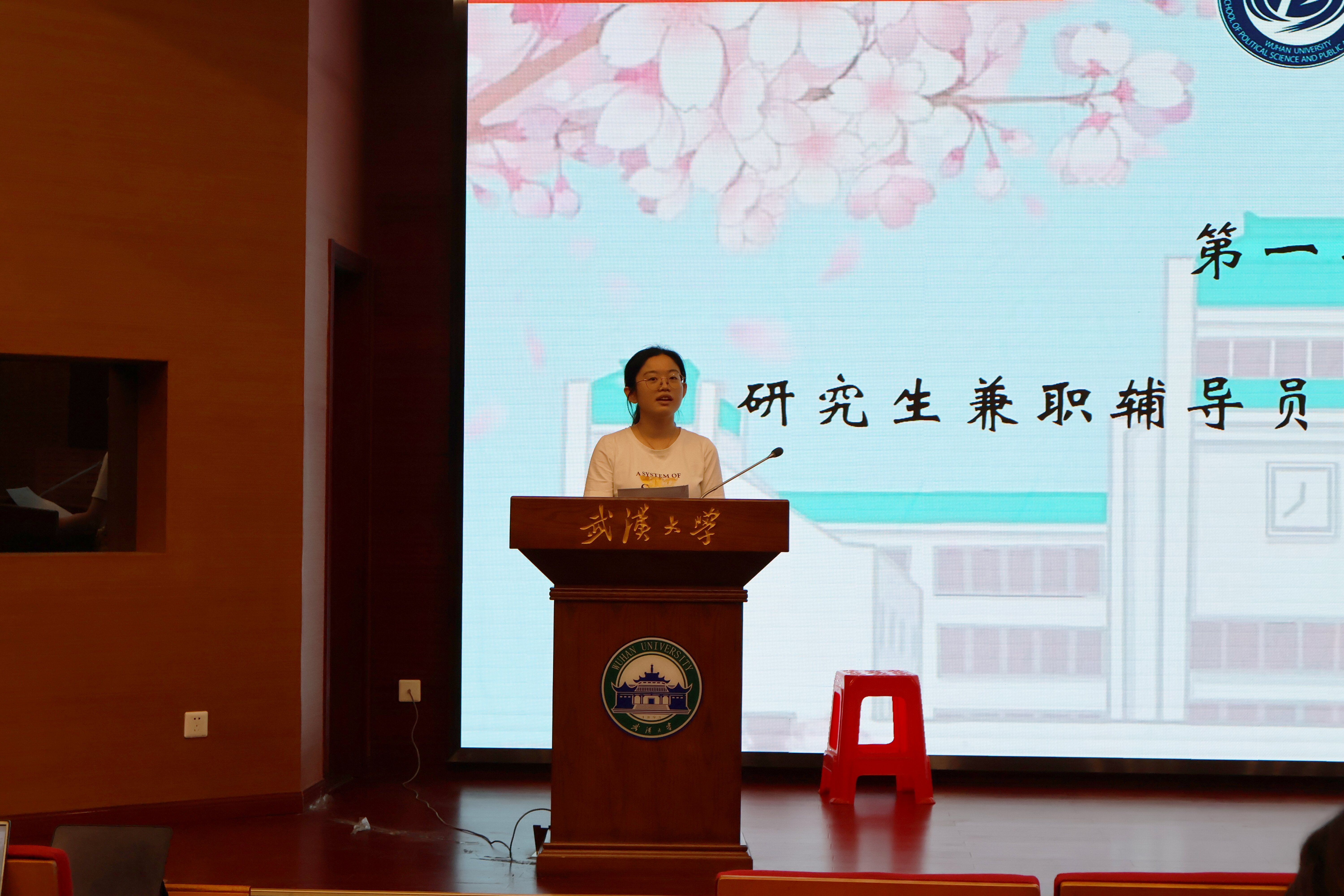 研究生兼职辅导员范秋砚老师参加了本次报告会并讲话。她表示实践锻炼中政管院的硕博研究生充分发扬了政管风采,体现了政管人的责任担当,彰显了珞珈青年的无限青春活力。她鼓励所有研究生新生同学在党的二十大召开之际,要以更大决心、更大担当再续新篇,主动到基层的广阔天地和日新月异的一线中去,展现政管人的抱负与情怀。