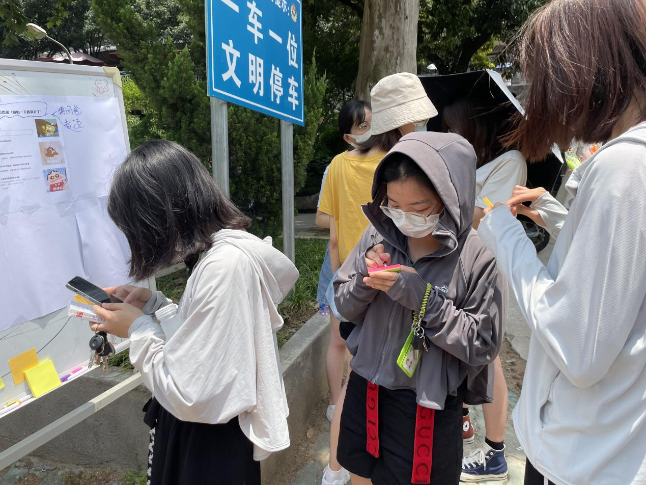 2022年6月6日中午,工作人员于梅园食堂门口摆放投掷框、涂鸦板及相关活动材料,路过的同学们对本次活动表现出了极大兴趣,纷纷参与投掷并留下了自己的烦恼、祝福和想要分享的感受。
