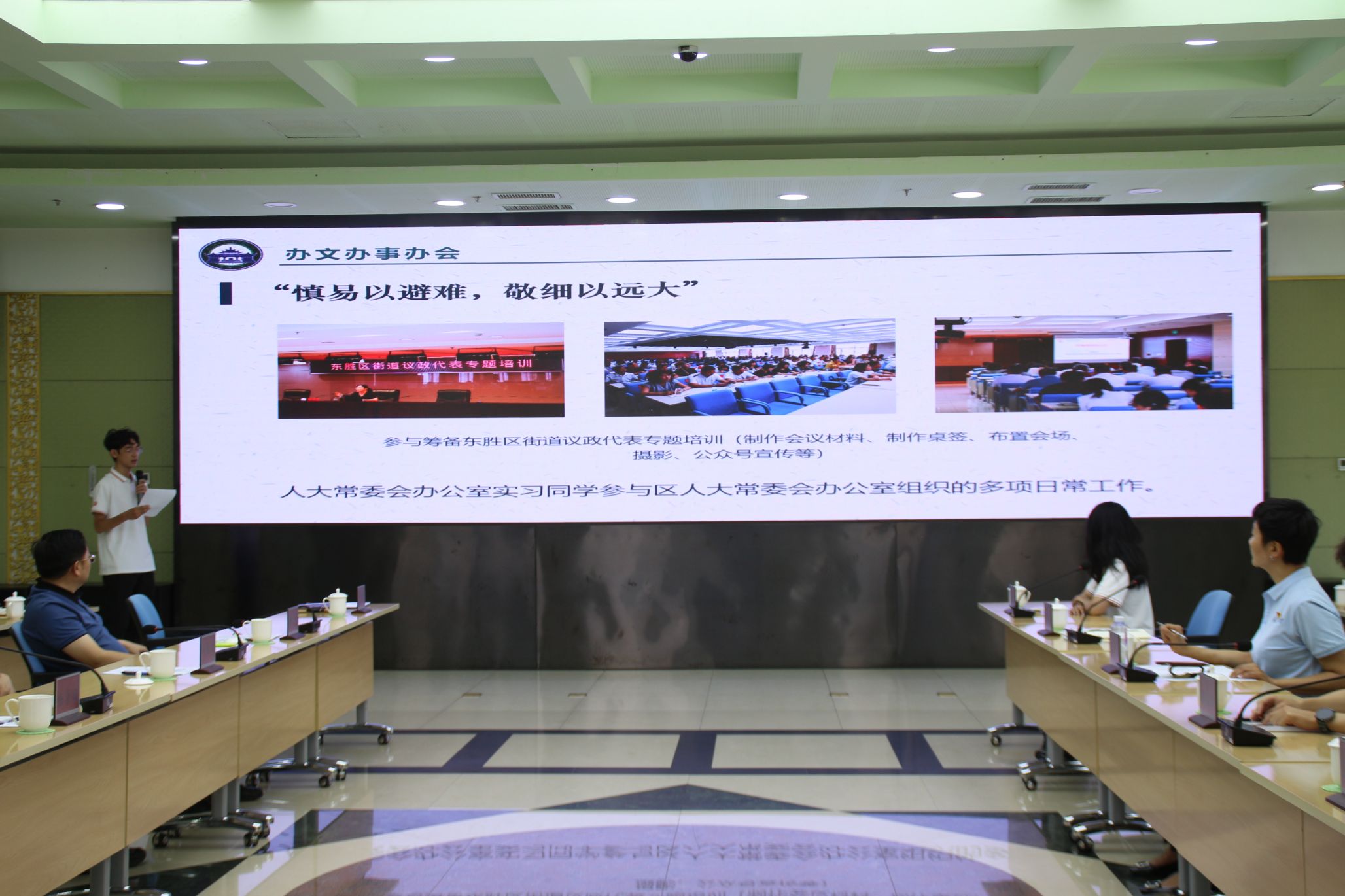 聘任仪式结束后,实践队全体成员以实习单位为小组,围绕实习实践期间的工作情况进行汇报。同学们纷纷表示,“本次实习实践机会十分难得,定当倍加珍惜”“我们用有限的时间,走遍鄂尔多斯的大街小巷,用心感悟北境小城的风土人情”“办公室的领导老师对我非常照顾,每一位都把我当亲弟弟一样,在传帮带中让我感受到这片土地的温暖”“基层工作中必须得那一份坚守与热爱,只有在服务群众中发光发热,才能在提升自我中发掘无限可能”“鄂尔多斯人民、东胜人民很友善、很真诚,人民群众精神面貌奋发昂扬”“我们将从基层做起、从小事做起,不断强化自身本领与综合素养,真正把新时代中国青年的显著优势转化为基层治理的实际效能”……